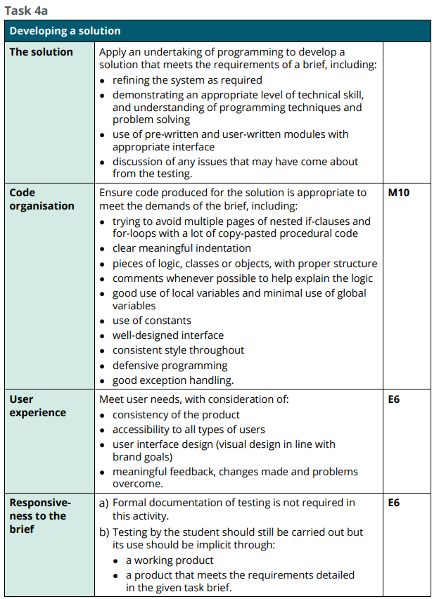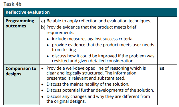 - a brief evaluation of your own performance, including considering areas that could be developed or improved in a future projec